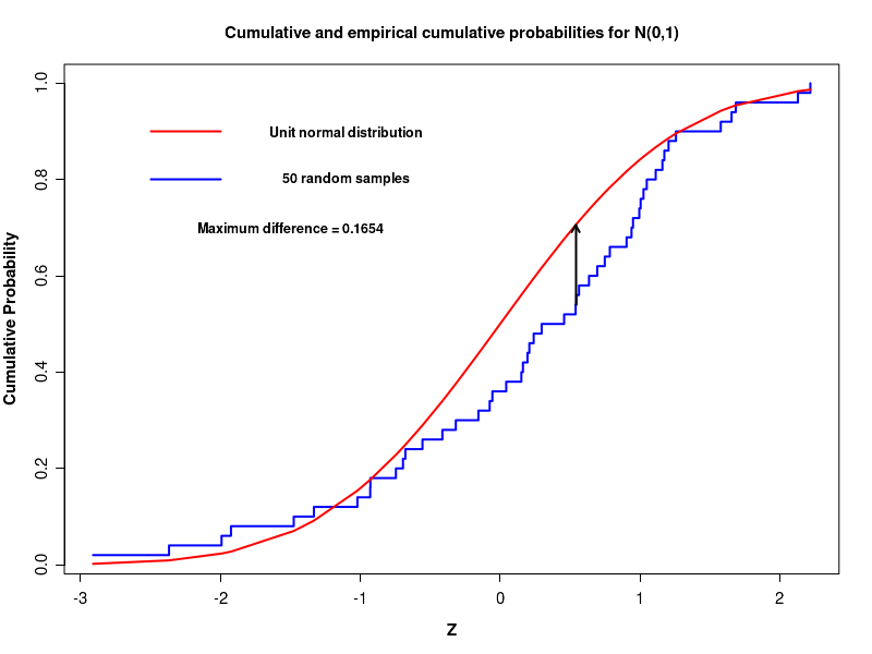 We will observe similar results for most of different simulations by changing the seed. What do we do if we have a sample data whose population mean and variance are not knwon for performing comparison in KS test? As a first example, we generate 20 samples from Gaussian of mean 24 and standard deviation 3. We then take a Z=tranform of this data and perform the KS test by comparing the Z transform with unit normal PDF, as demostrated in the following lines of script:Exact one-sample Kolmogorov-Smirnov test data: X D = 0.47686, p-value = 0.000106 alternative hypothesis: two-sided