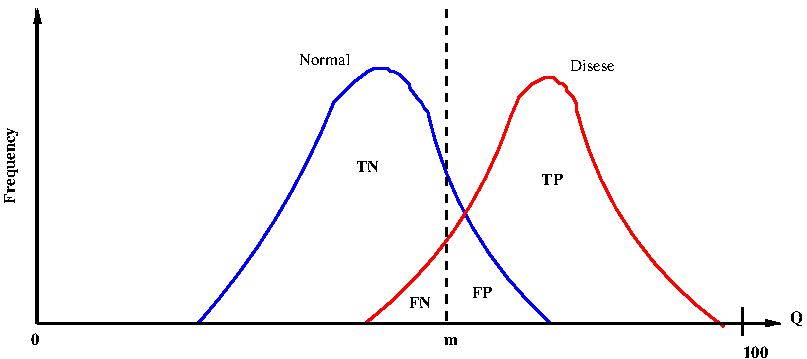 Any subject with measured value \(\small{Q \lt m}\) is diagnosed to be normal and those with value \(\small{Q \gt m}\) is diagnosed to have the disease.
