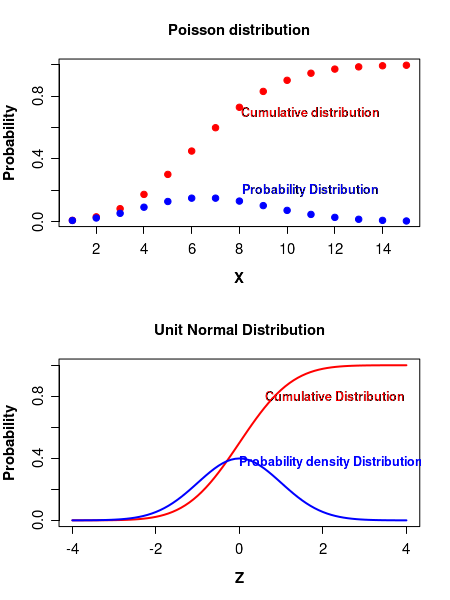 Example 1: The Cumulative Density Function for a Poisson distribution with mean $\mu$ is given by $~~F(x)~=~\displaystyle \sum_{X=0}^{x} \dfrac{\mu^X e^{-\mu}}{X!}$
