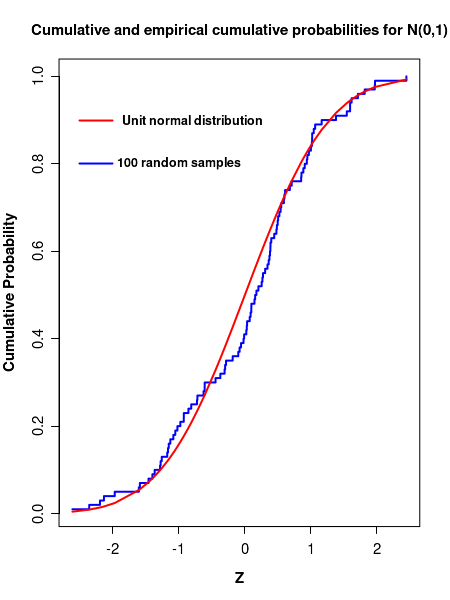 main="Cumulative and empirical cumulative probabilities for N(0,1)",