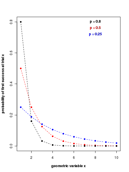 Therefore, the probability density function of geometric distribution that gives the probability of observing the first success on \(x^{th}\) trial, with \(p\) being the probability of success for each trial is given by ,