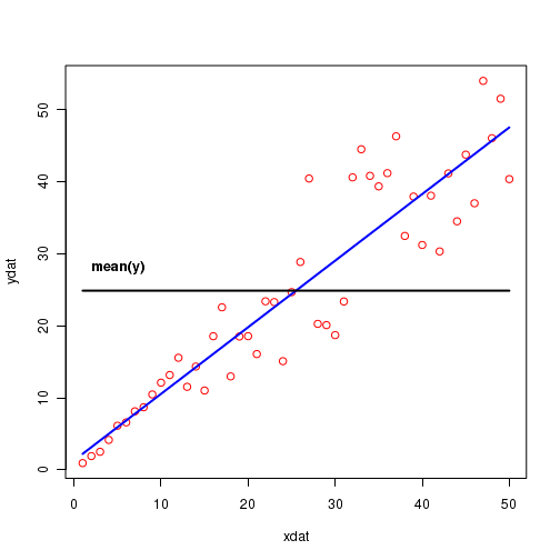 In the Figure-5 below, the blue line is the regression line through the data points represented by red circles. The location of horizontal black line shows the mean of y values of data points.