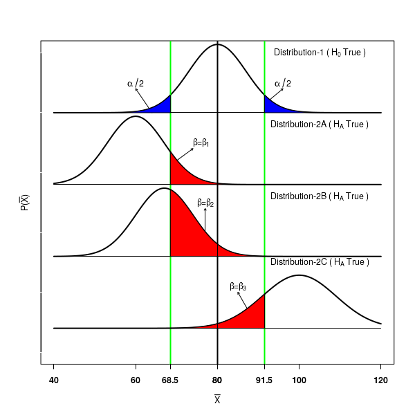 Since the alternate hypothesis is true, all the mean values \(\small{\overline{x}}\) on the Distribution-2 should be rejected by the test. However, because we are looking at the acceptance region $(68.5, 91.5)$ around \(\small{\mu=80}\) in the first curve, we will erroneously recognise the values of \(\small{\overline{x}}\) from Distribution-2 that lie in the region $(68.5, 91.5)$ to be accepting the null, while they are actually rejecting it!. This area $\beta=\beta_1$ is marked red in Distribution-2.