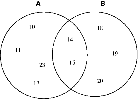 Let   A = {10, 11, 23, 13, 14, 15}   and   B = {14, 15, 18, 19, 20} be two subsets of sample space S. See their Venn diagram below: