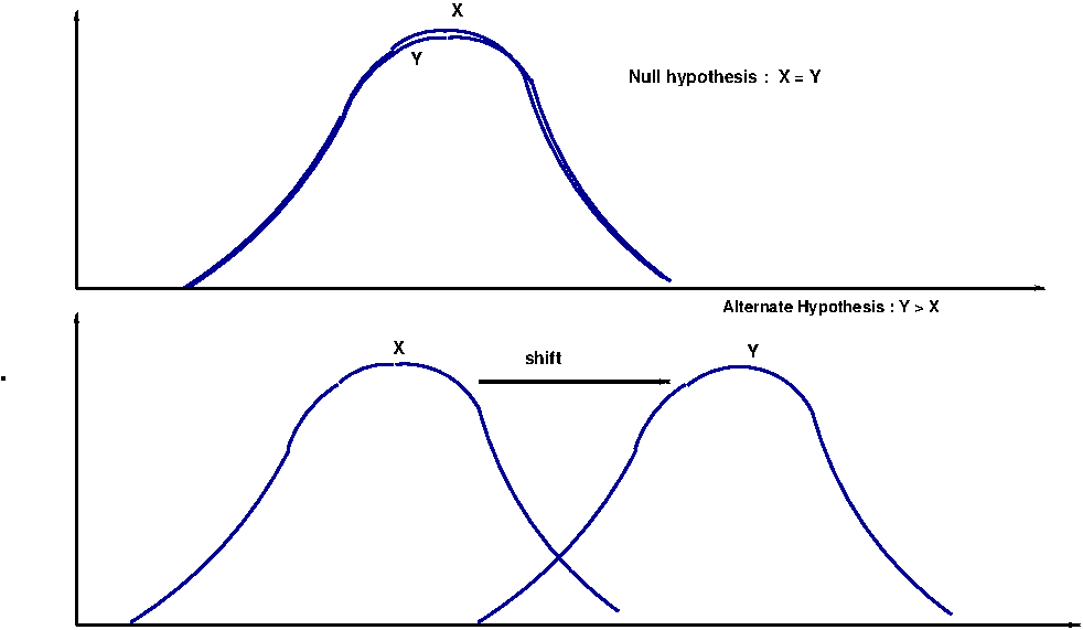 "Null hypothesis that \(\small{X=Y}\) against an alternatives \(\small{X \gt Y }\), \(\small{X \lt Y }\) and \(\small{X \neq Y }\)"