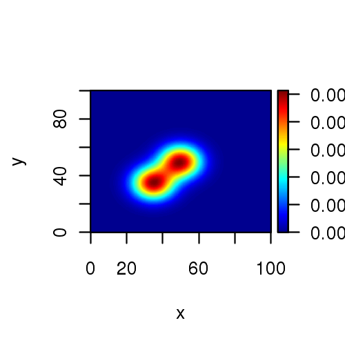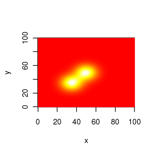 ## Creating images in R ########################################## ### We first create a Gaussian quardrature data. ## Gaussian across X and Y ## 2D Gaussian Kernal x = seq(0,100,0.2) y = seq(0,100,0.2) z = matrix(data=NA, nrow=length(x), ncol=length(x)) z1 = matrix(data=NA, nrow=length(x), ncol=length(x)) z2 = matrix(data=NA, nrow=length(x), ncol=length(x)) sigma = 8.0 sigma1 = 8 sigma2 = 8 mux = 50.0 muy = 50.0 mux1 = 35.0 muy1 = 35.0 A = 1.0 A1 = 1.0 for(i in 1:length(x)) { for(j in 1:length(y)) { z1[i,j] = A * (1/(2*pi*sigma1*sigma2)) * exp( -((x[i]-mux1)^2 + (y[j]-muy1)^2)/(2*sigma1*sigma2) ) z2[i,j] = A * (1/(2*pi*sigma^2)) * exp( -((x[i]-mux)^2 + (y[j]-muy)^2)/(2*sigma^2) ) z[i,j] = z1[i,j] + z2[i,j] } } #### NOTE : At this point, instead of x,y,z generated above, we can use any data. # We call image() function of Graphics library to plot (x,y,z) generated above image(x,y,z, col=heat.colors(60)) ## Try these 2 options for 'col' parameter to get pretty plots! # image(x,y,z, col=terrain.colors(60)) # image(x,y,z, col=topo.colors(60)) ###----------------------------------------------------------------------------- X11() ## We now call image2D() function from library plot3D. ## note **** : coordinates are given in the order z,x,y for this function. image2D(z,x,y)